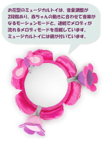 お花型のミュージカルトイは、音量調整が2段階あり、赤ちゃんの動きに合わせて音楽がなるモーションモードと、連続でメロディが流れるメロディモードを搭載。